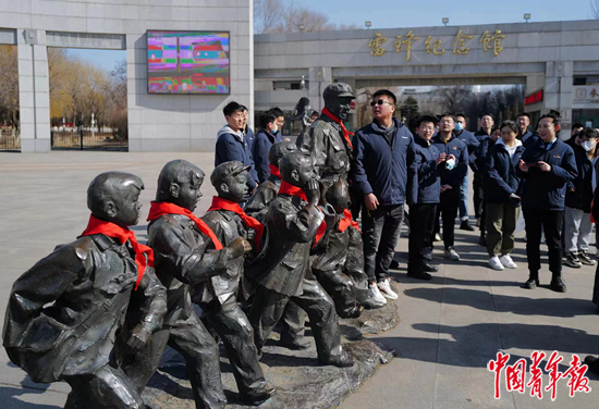 3月2日,辽宁省抚顺市雷锋纪念馆门前,来参观的青年在雷锋塑像旁。中青报·中青网记者 赵迪/摄