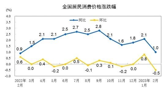 从环比看,2月CPI由上月上涨0.8%转为下降0.5%。其中,食品价格由上月上涨2.8%转为下降2.0%,影响CPI下降约0.38个百分点。