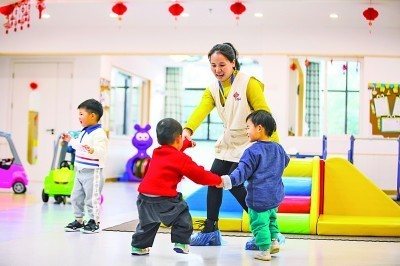 2月22日,位于福建省福州市鼓楼区安泰街道乌塔社区的一家托育园内,孩子们在社区工作者陪伴下玩耍。谢贵明摄/光明图片