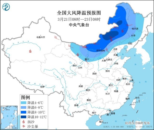 同时,伴随着沙尘入侵,北方地区也将出现明显的大风降温天气。西北地区东北部、内蒙古、华北、东北地区等地的部分地区有4-6级偏北风,阵风7-9级,上述地区大部有4~6℃降温,部分地区10℃以上。