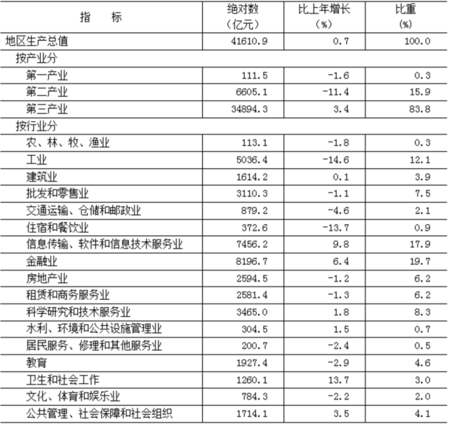 初步核算,全年实现地区生产总值41610.9亿元,按不变价格计算,比上年增长0.7%。其中,第一产业[2]增加值111.5亿元,下降1.6%;第二产业增加值6605.1亿元,下降11.4%;第三产业增加值34894.3亿元,增长3.4%。三次产业构成为0.3︰15.9︰83.8。按常住人口计算,全市人均地区生产总值为19.0万元。