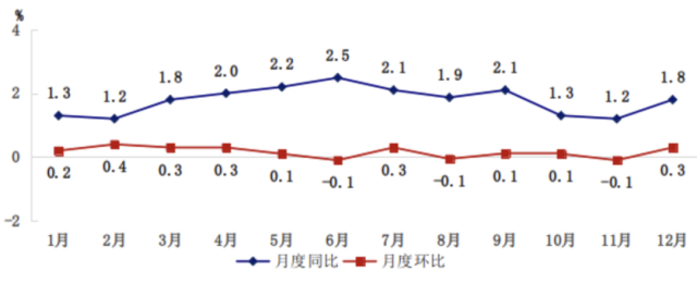 全年居民消费价格总水平比上年上涨1.8%。工业生产者出厂价格上涨2.3%,工业生产者购进价格上涨6.2%。农产品生产者价格上涨2.7%。12月份,新建商品住宅销售价格环比指数为100.2、同比指数为105.8;二手住宅销售价格环比指数为99.6、同比指数为103.9。