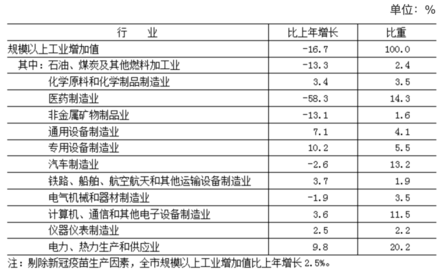 全年实现工业增加值5036.4亿元,按不变价格计算,比上年下降14.6%。其中,规模以上工业[4]增加值下降16.7%,剔除新冠疫苗生产因素增长2.5%。在规模以上工业中,电力、热力生产和供应业增长9.8%,计算机、通信和其他电子设备制造业增长3.6%,汽车制造业下降2.6%,医药制造业下降58.3%(剔除新冠疫苗生产因素后增长6.4%)。规模以上工业实现销售产值22366.3亿元,下降5.7%。其中,内销产值20560.5亿元,下降1.8%;出口交货值1805.8亿元,下降35.0%。