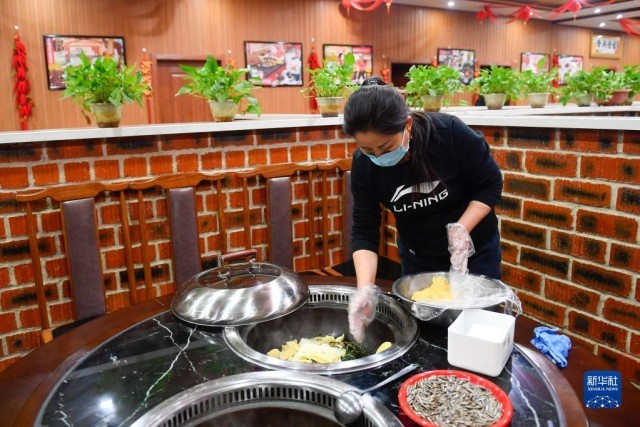 在吉林省吉林市永吉县北大湖镇南沟村,一家农家乐的经营者为客人准备菜品(2022年11月21日摄)。新华社记者 许畅 摄