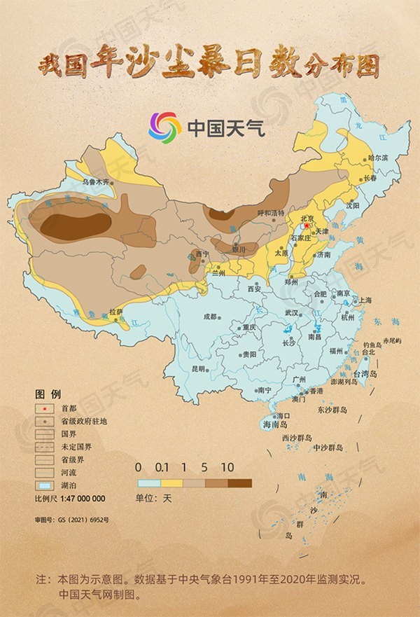 中国天气网统计1991年至2020年来,我国沙尘暴日数的分布情况,可以看出沙尘天气主要影响我国北方地区,其中,南疆盆地和内蒙古西部两地是沙尘暴的高发区,年沙尘暴日数在10天以上,部分地区超过20天。