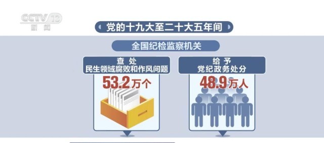 党的十九大至二十大五年间,全国纪检监察机关共查处民生领域腐败和作风问题53.2万个,给予党纪政务处分48.9万人;查处扶贫领域腐败和作风问题29.9万个,给予党纪政务处分20.2万人;查处乡村振兴领域腐败和作风问题4.8万个,给予党纪政务处分4.6万人。