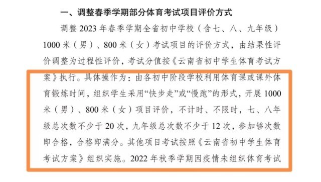 根据通知,本次体育考试主要是调整初一到初三男生1000米、女生800米跑的评价方式,由结果性评价调整为过程性评价,分值按《云南省初中学生体育考试方案》执行,其他项目的考试不变。