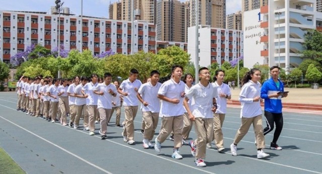 昆明市第一中学西山学校的学生们在进行跑步锻炼