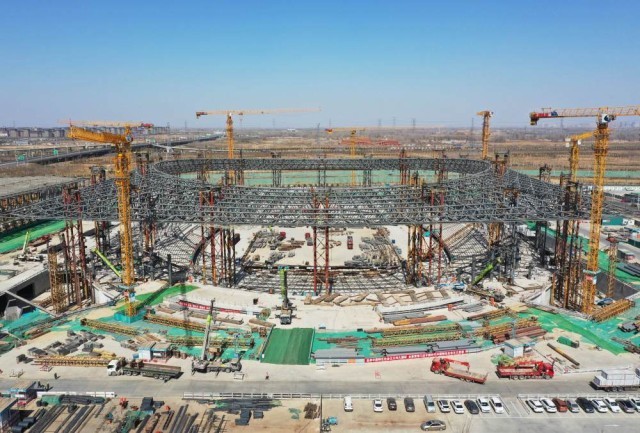 这是位于雄安新区启动区的雄安体育中心项目现场(2023年3月15日摄,无人机照片)。新华社记者 朱旭东 摄
