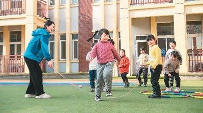 芜湖市繁昌区孙村镇中心幼儿园延时服务课堂上,孩子们在老师的陪伴下跳绳。