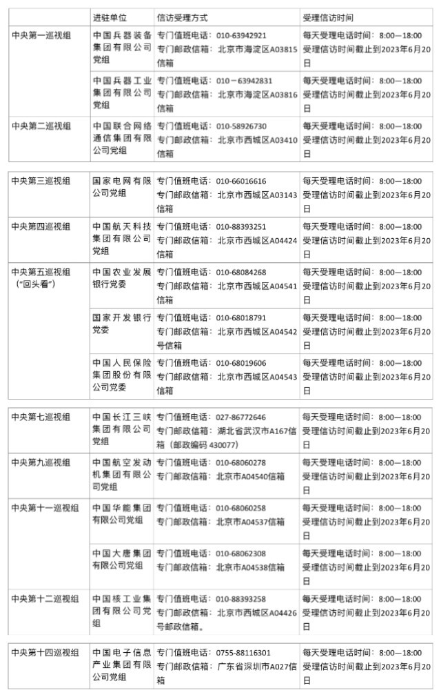 日前,二十届中央第一轮巡视的15个巡视组开始陆续进驻被巡视单位党组织开展巡视工作。中纪委官网今日公布首批14家被巡视单位信访受理方式。