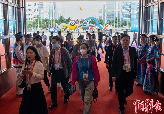 4月10日,海南省海口市,海南国际会展中心,第三届中国国际消费品博览会开幕,来自全国乃至世界各地的参观者在黎族装扮的工作人员迎接下步入会场。中青报·中青网记者 李峥苨/摄