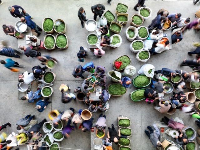 茶商在贵州省遵义市湄潭县湄江茶青交易市场内收购茶青(无人机照片,2023年4月4日摄)。新华社记者 欧东衢 摄