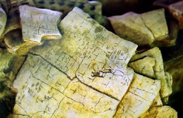 图为从殷墟遗址甲骨窖穴内发掘出土的刻有文字的龟甲 新华社记者 王颂 摄