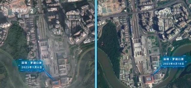 这里是广东深圳罗湖口岸地区。1月6日,从内地与香港恢复通关前两天的卫星影像画面中可以看出,罗湖口岸附近的道路上行驶的车辆不多,深圳火车站的站前广场比较空旷。而这是4月16日、恢复通关第99天的卫星影像,可以看到,深圳火车站停车场车辆明显增多,在附近等客的出租车排队几百米。罗湖口岸全面恢复通关以来,出入境旅客量不断攀升,也让它成为深圳出入境客流量最大的口岸,往日内地和香港两地人员跨境往来的热闹景象再次重现。
