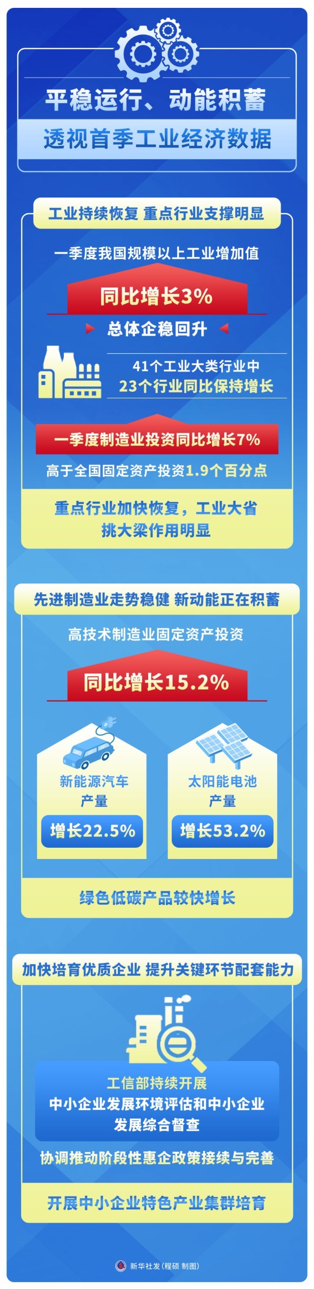 “面对复杂多变的外部环境和各种风险挑战,各地各部门狠抓政策落实,加快复工复产,强化助企纾困,一季度工业实现平稳开局。”工信部总工程师赵志国说,工业生产稳步回升的同时,制造业投资持续增长。