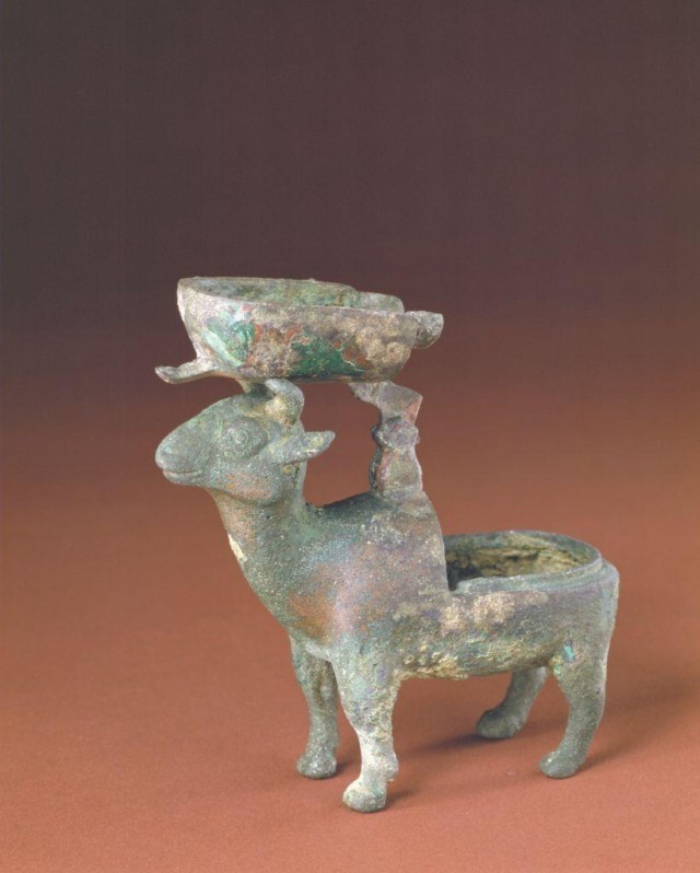 △铜羊灯,北京故宫博物院藏。汉代的灯主要以脂膏为燃料,一般是动物或植物的油脂。使用时将灯炷缚成束浸在脂里点燃照明,古人称其为“膏烛”。