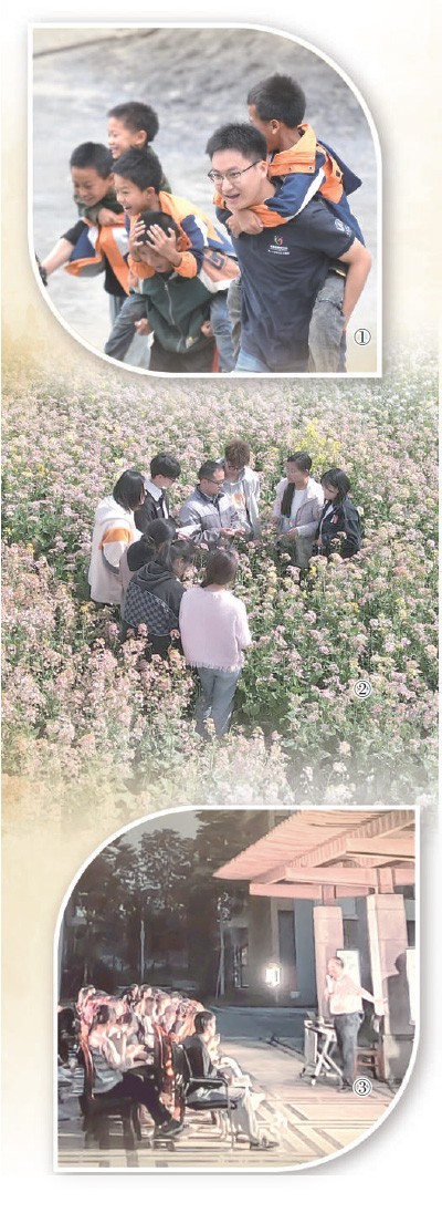 图①:在贵州毕节市大方县为民小学,华中农业大学研究生支教团志愿者郭子鸣与二年级学生玩背人赛跑。华中农业大学供图