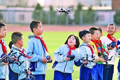 内蒙古呼和浩特市赛罕区大学路小学教育集团西把栅校区的学生在体验操控无人机。新华社发