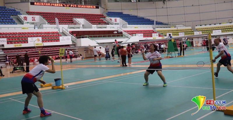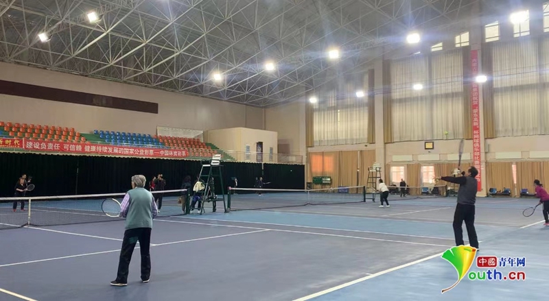 4月25日上午,在内蒙古自治区通辽市奈曼旗全民健身中心网球馆内,正在举行老年人网球比赛。一位84岁的奶奶和她82岁的老伴一组,参与了此次比赛。中国青年网记者 宋莉 摄