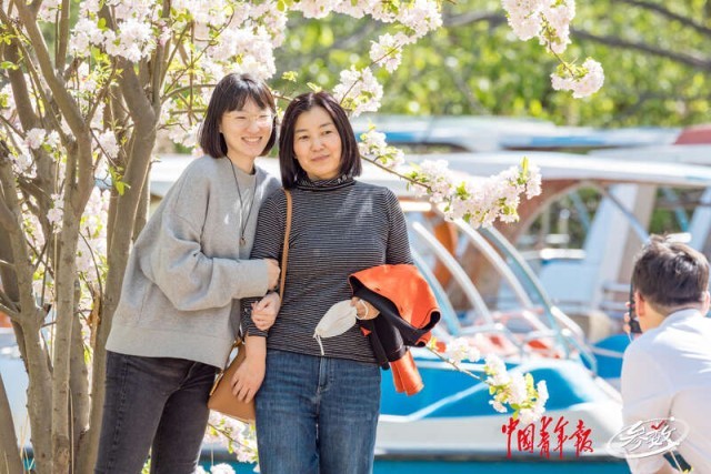 奥林匹克森林公园,许多人和家人共同出游,共享春色。一名女孩正在与家人合照。 中青在线记者 白杨/摄
