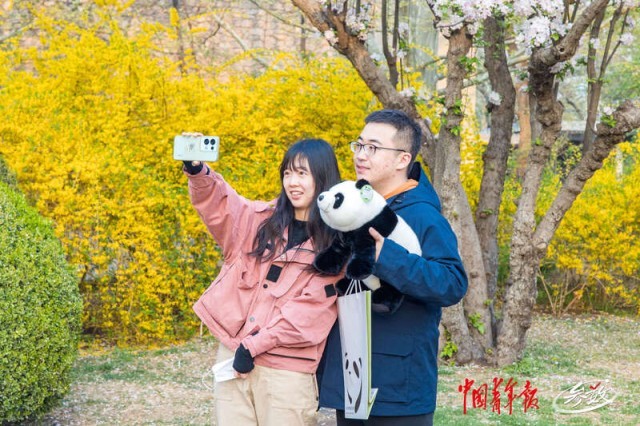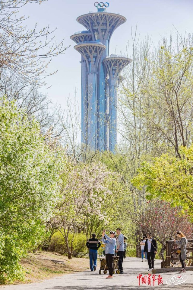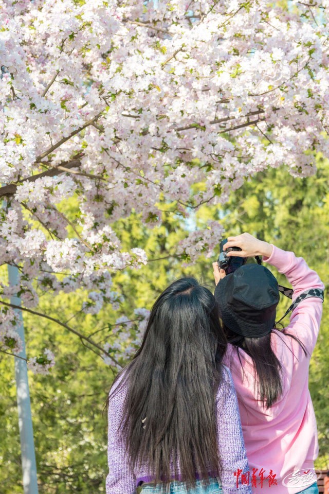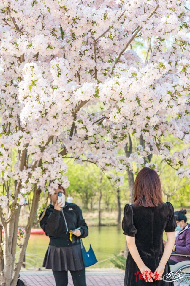 在奥林匹克森林公园的一棵海棠花树下,游客正在拍照。在社交媒体平台上,各种“赏花攻略”“春游指南”成就了许多拍照胜地。中青报·中青网见习记者 吴欣宇/摄