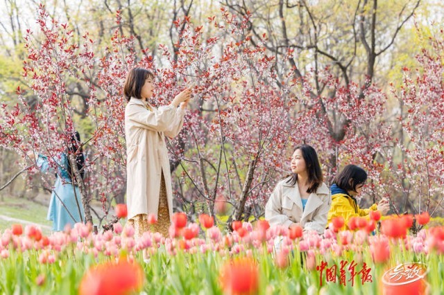 在朝阳公园的郁金香花海,游客举起手机拍照留念。调查显示,81.6%的受访者认为“走向户外、拥抱自然”是重要的。中青在线记者 林天羽/摄