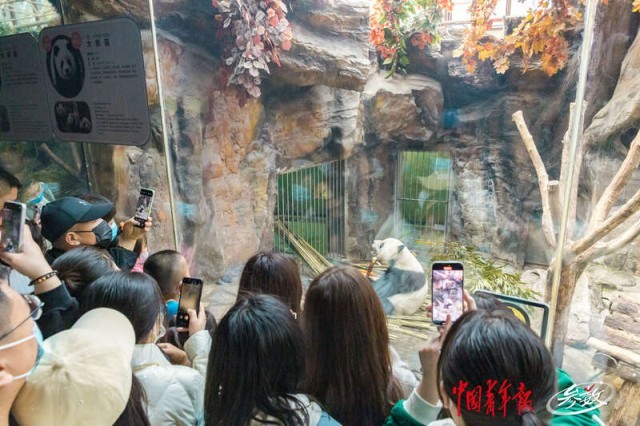 北京动物园大熊猫馆,大熊猫正在吃竹子,馆内挤满了拍照围观的游客。 此前,大熊猫“萌兰”因为活泼好动获得了大批游客和网友的喜爱。 中青在线记者 林天羽/摄