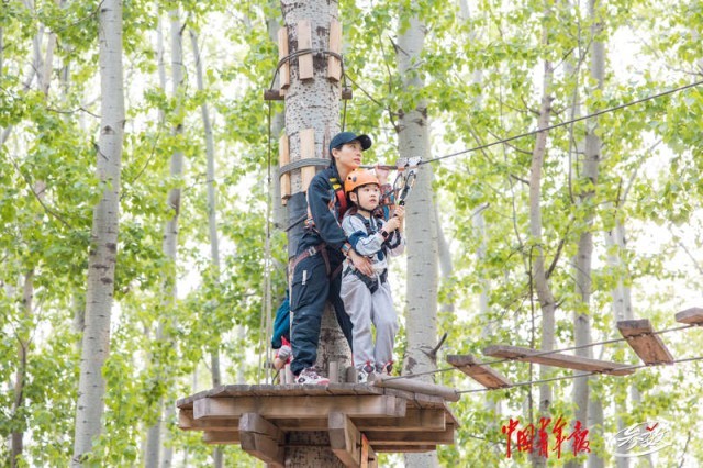 亲子户外运动也成为春日公园里的一道“风景线”。朝阳公园内,一名小朋友和他的家长穿戴好防护索套,准备进行“空中探险”游戏。 调查显示,30.8%的受访者表示春日出行会选择爬山等户外运动。 中青在线记者 白杨/摄