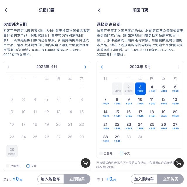 4月30日下午,记者搜索发现,上海迪士尼乐园五一假期多个单日门票已售罄。图片来源:迪士尼度假区app截图