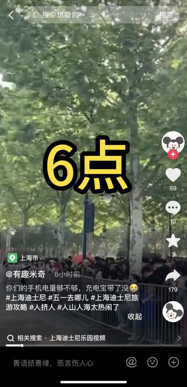 网友在社交平台分享4月30日早上的上海迪士尼排队情况。 图片来源:抖音视频截图