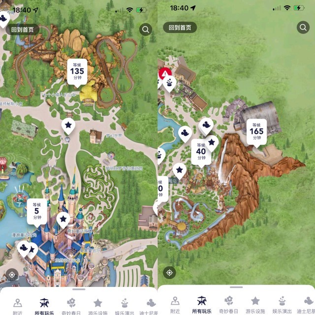 4月30日下午六时许,翱翔·飞跃地平线、七个小矮人矿车等热门项目仍需排队超过两个小时。图片来源:迪士尼度假区app截图