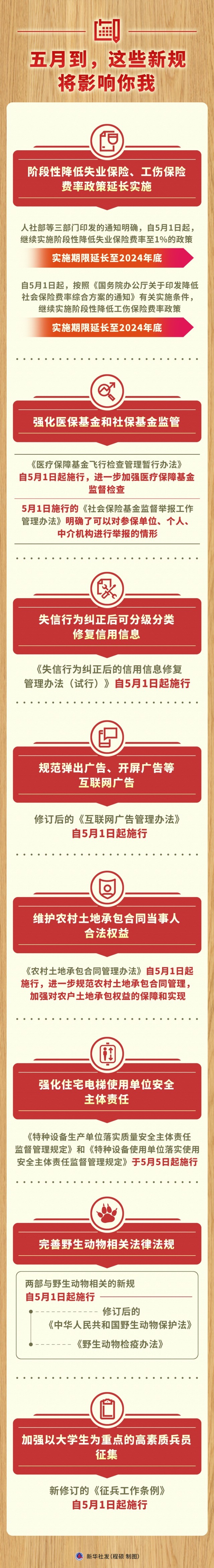 五月如约而至,一批开始施行的新规影响你我生活。阶段性降低失业保险、工伤保险费率政策延长实施,失信行为纠正后可分级分类修复信用信息,对弹出广告、开屏广告等加强规范管理……哪条你最关心?