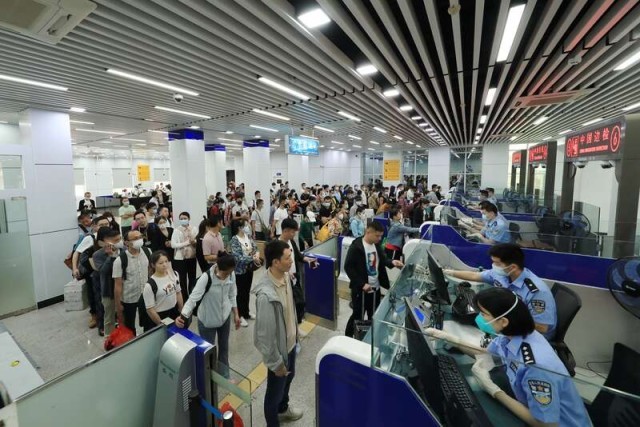 5月1日上午,东兴口岸出境大厅旅客正在排队接受边防检查。 林珉正/摄