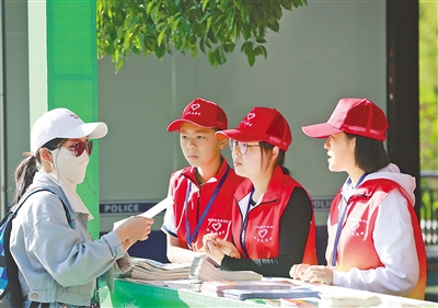 5月1日,湖南张家界国家森林公园,志愿者为游客引导游览线路。 吴勇兵摄(影像中国)