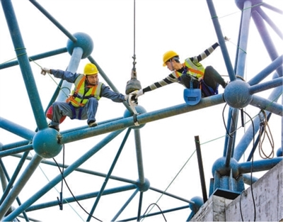 5月2日,建设者在甘肃张掖奥体中心建设项目现场吊装和焊接安装钢结构屋架。 王 将摄(人民视觉)