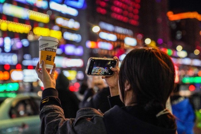 游客手拿咖啡在延吉市打卡拍照。新华社记者 颜麟蕴 摄