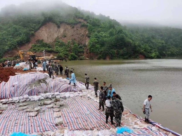 5月6日,江西省丰城市民兵应急分队做好溃口封堵,低洼处护坡、合围工作。肖尚来/摄