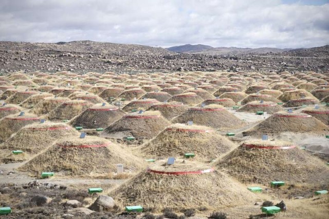 但那又不像是一般的土岗子。它们的体格过于庞大,每一个都足足占地36平方米。它们周身荒草杂生,两两之间却均匀地保持着30米间距,以品字形有规律地散布在1.36平方公里的高原上。它们身上都有一抹红——扎着“红头绳”,上面统一写着6个大写字母——LHAASO。