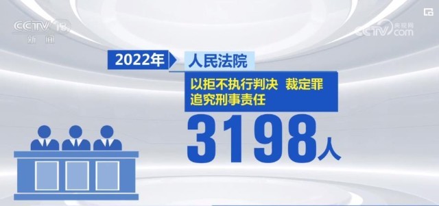 2022年,人民法院以拒不执行判决、裁定罪追究刑事责任3198人。下一步,最高人民法院将联合公安机关、检察机关开展集中打击拒不执行判决、裁定犯罪专项行动,建立健全公检法机关依法惩治拒不执行判决、裁定犯罪的常态化工作机制。