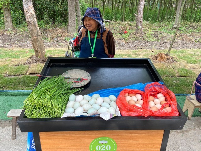 5月19日早上8时,上海奉贤区南桥镇沈陆中心路自产自销疏导点,菜农们的摊位上摆着黄瓜、番茄、四季豆、土豆、小白菜、鸡蛋等,顾客来来往往、问价挑菜。仔细观察,许多菜不似超市货架上的果蔬那般水灵,有的带着泥土,有的菜叶上有虫洞;摊主中不乏七八十岁头发花白的老人,一个小推车、几个泡沫箱就装上菜来了。这是专供沈陆村村民卖瓜果蔬菜的摊位,还在试运营阶段。