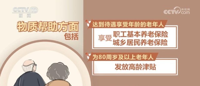 物质帮助方面包括:达到待遇享受年龄的老年人享受职工基本养老保险和城乡居民养老保险;为80周岁及以上老年人发放高龄津贴;为经济困难的老年人提供养老服务补贴;为经认定生活不能自理的老年人提供护理补贴;为纳入最低生活保障范围的老年人提供最低生活保障;经认定符合条件的残疾老年人享受困难残疾人生活补贴和重度残疾人护理补贴;对生活无着的流浪、乞讨老年人依照有关规定给予救助。
