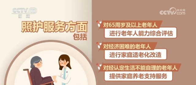 照护服务方面包括:对65周岁及以上老年人进行老年人能力综合评估;对经济困难的老年人进行家庭适老化改造;对经认定生活不能自理的老年人提供家庭养老支持服务;对特困老年人进行集中供养或者分散供养;对国家和社会作出特殊贡献的老年人提供集中供养服务;计划生育特殊家庭老年人优先享受机构养老。