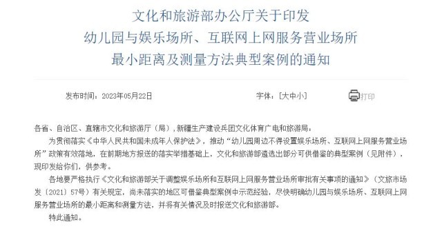 为贯彻落实《中华人民共和国未成年人保护法》,推动“幼儿园周边不得设置娱乐场所、互联网上网服务营业场所”政策有效落地,在前期地方报送的落实举措基础上,文化和旅游部遴选出部分可供借鉴的典型案例(见附件),现印发给你们,供参考。
