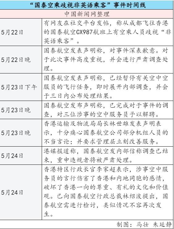 中新网5月24日电 综合报道,5月22日,有网友在社交平台发帖,称从成都飞往香港的国泰航空CX987航班上有空乘人员歧视“非英语乘客”。事件持续发酵,引起外界的广泛关注。目前,国泰航空、香港特区政府行政长官、香港运输及物流局局长、香港平等机会委员会对此事陆续做出回应。