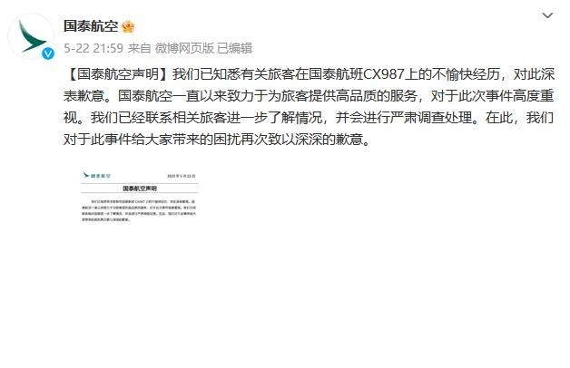 22日晚,国泰航空发声明称,已知悉有关旅客在CX987航班上的不愉快经历,公司对此深表歉意,并联系相关旅客进一步了解情况,会进行严肃调查处理。