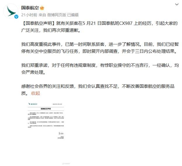 23日,国泰再次发声明称,已第一时间联系旅客,目前已经暂停有关乘务员的飞行任务,即时展开内部调查,并会于三日内公布处理结果。