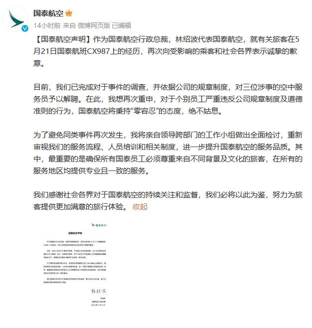 当天晚上,国泰三度致歉,并发布开除3名涉事乘务员的声明。国泰航空行政总裁林绍波在声明中称,将领导跨部门的工作小组做出全面检讨,重新审视该公司的服务流程、人员培训和相关制度,进一步提升国泰航空的服务质量。其中,最重要的是确保所有国泰员工必须尊重来自不同背景及文化的旅客,在所有的服务地区均提供专业且一致的服务。
