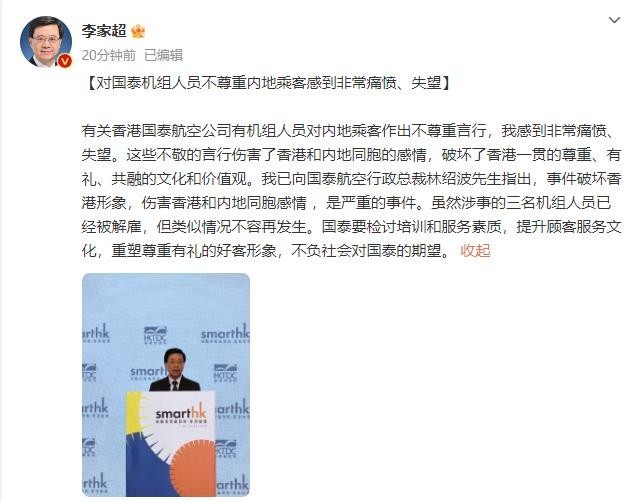 李家超表示,他已向国泰航空行政总裁林绍波提出,此次事件属于严重事件,国泰航空需进行检讨,类似情况不容再次发生。