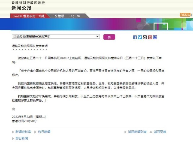 香港运输及物流局局长林世雄23日晚间发布声明表示,十分痛心国泰航空公司部分机组人员的不当言论,事件严重违背香港优良的待客之道、一贯的价值观和道德标准。
